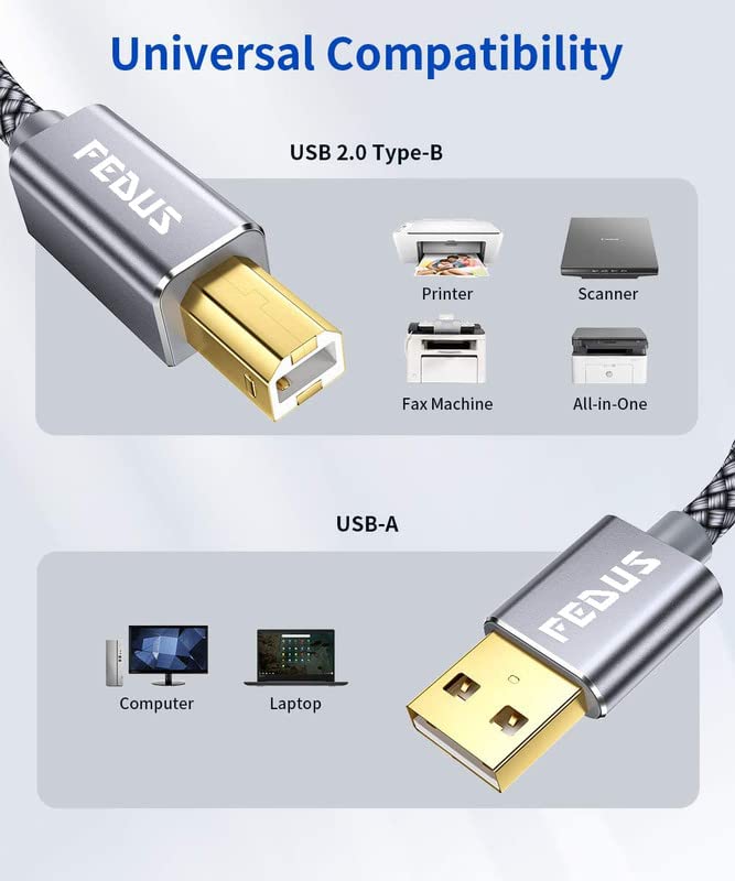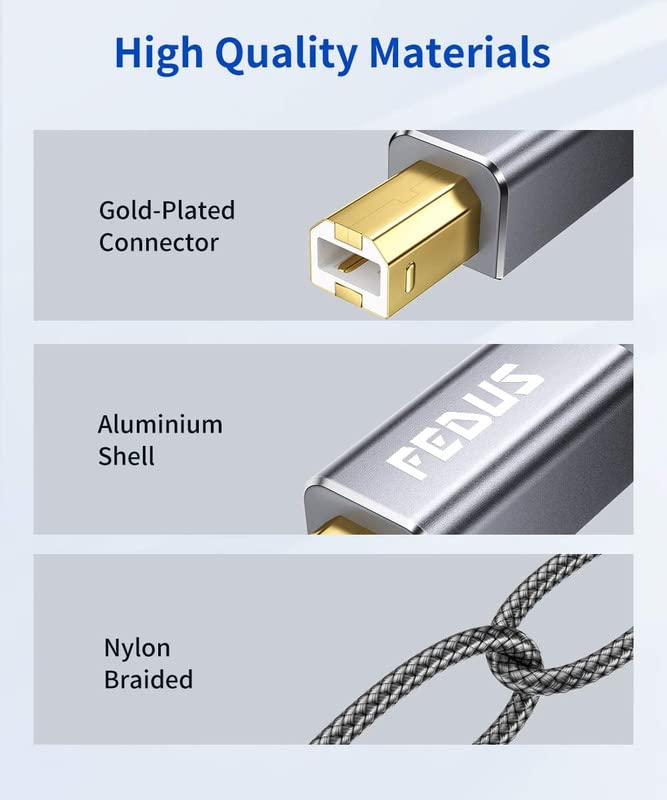 The FEDUS 3 Meter USB Printer Cable features a nylon braided design and gold-plated connectors for fast, reliable data transfer. Compatible with Brother, HP, Epson, Canon, Lexmark, and more, this durable USB A to USB B 2.0 cable is perfect for printers and scanners.