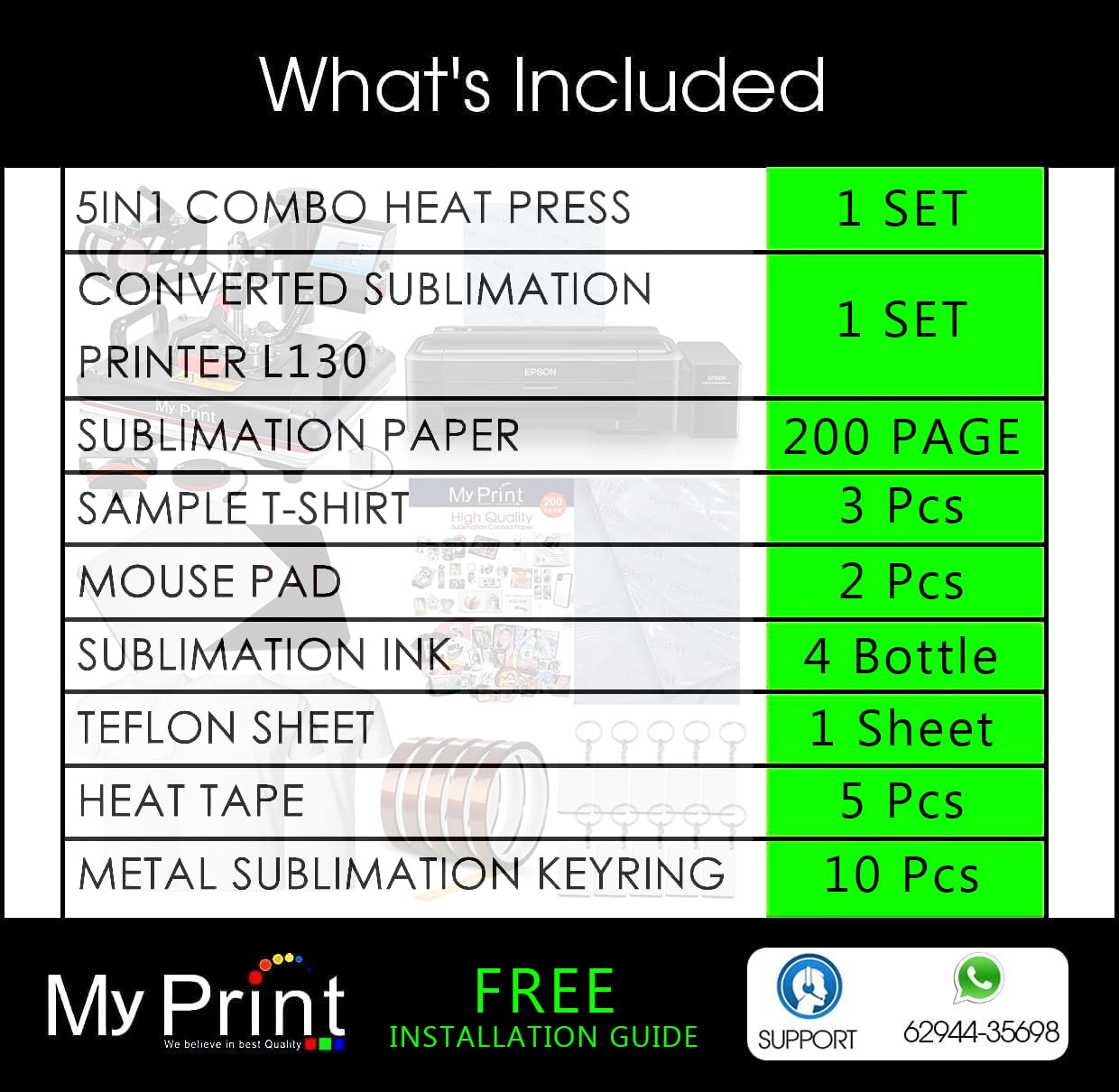 Start your custom printing business with the MY PRINT 5-in-1 Sublimation Combo—includes L130 printer, sublimation ink, 200 papers & heat press for t-shirts, mugs, caps, and more.